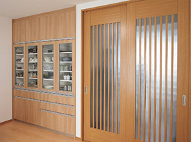 そして、日々の家事をこなされるM様は、システムキッチンと壁一面にビルトインされたキャビネットをリクエストされました。「この収納が、女性の来客に大評判なんです。インテリアに合っていて、すっきりしていて…。造り付けでないと、こうはいきませんね」。