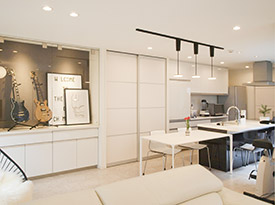 プランニングにあたってT様は、フラットな屋根のモダンな建物を希望されました。「外観は以前からイメージを持っていました。また、愛車を収める広めの車庫や、大事なギターを飾るスペースもリクエストしました」。