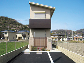 間口をできる限り広く取る、床面積のロスを極力減らす、快適性を損なわない…。これらの課題をクリアするためにパナホームが立案したプランは、玄関を東面の中央付近に設けて、1LDKタイプを1階と2階に1戸ずつ配置、南北面(両サイド)にある道路側に駐車スペースを確保するというものでした。
