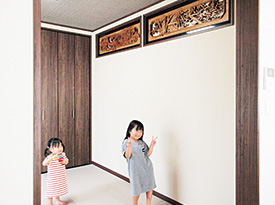 そのひとつが、お祖母様の家にあった欄間を和室に再利用することでした。「最初は似合わないんじゃないかと思いましたが、完成してみるとぴったり。新居に祖母の思い出が残せて感謝しています」と、奥様はこのアイデアにとてもお喜びです。
