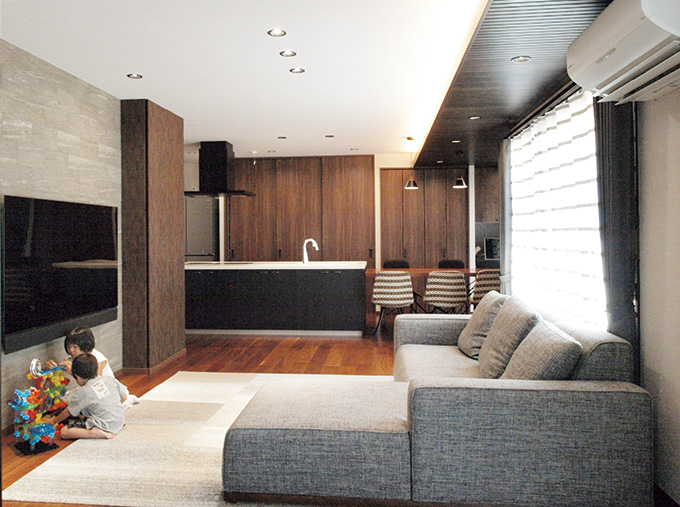 例えば、書斎への入口を鏡張りの隠し扉にしたり、キッチンの収納扉を特注にしたり、キッチンカウンターと換気扇の組み合わせを定番にはないものにするなど、ご夫妻が気に入られた当社の加古川展示場のインテリアをベースに、次々にご希望を盛り込んでいかれました。