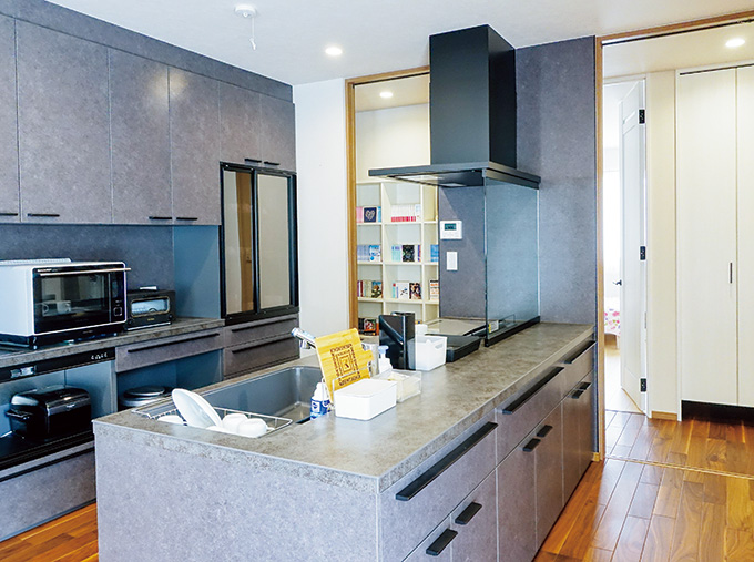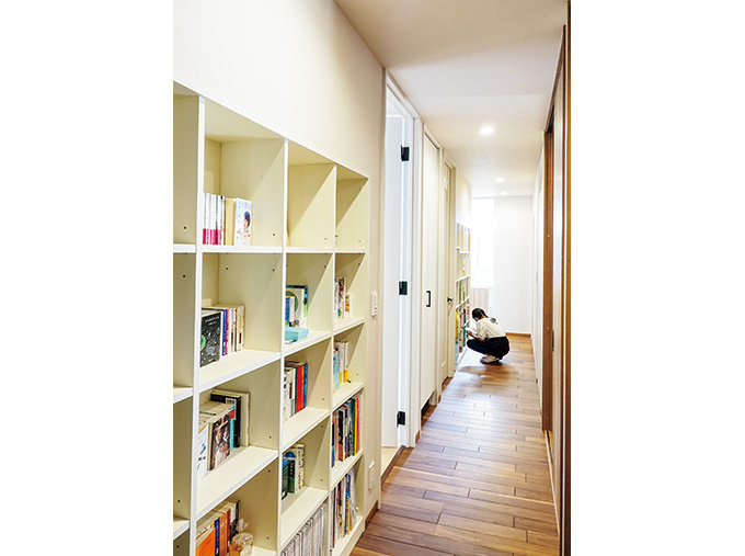 主寝室には隠れ家のような書斎があり、壁一面の書棚にはご主人の蔵書がぎっしり並んでいます。さらに、子供部屋の前の廊下の壁面には書棚が設けられ、まるで図書館のような趣です。