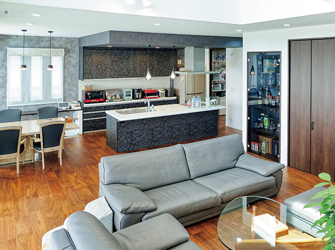 S様が要望されたのは、大きな吹き抜けと広いリビング、ご主人が料理の腕を存分に振るうことのできるキッチン、食品をたっぷり収められるパントリーなどでした。
