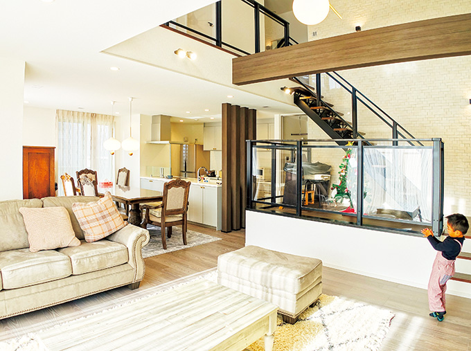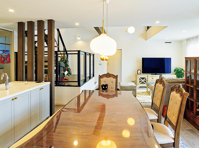 欧風の門扉を抜け、アプローチを進んで玄関から中に入ると、そこには大きな吹き抜けとスキップフロアのある広々としたリビングが…。「期待感と共に、おおらかに人を迎え入れたい」というご夫妻のお住まいに対する思いが、ここに凝縮されています。