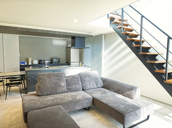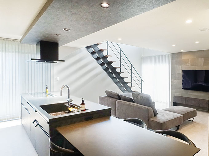 それは、完成したご新居にしっかりと反映されています。外構を含め、カラーは内外観共にブラック・グレー・ホワイトの3色を基調に展開。リビングには吹き抜けとストリップ階段が設けられ、キッチンにはアイランドスタイルの最上級モデルが…。「色はシンプルにすれば間違いないと考えました。LDKは姫路展示場を参考にしました」と奥様。